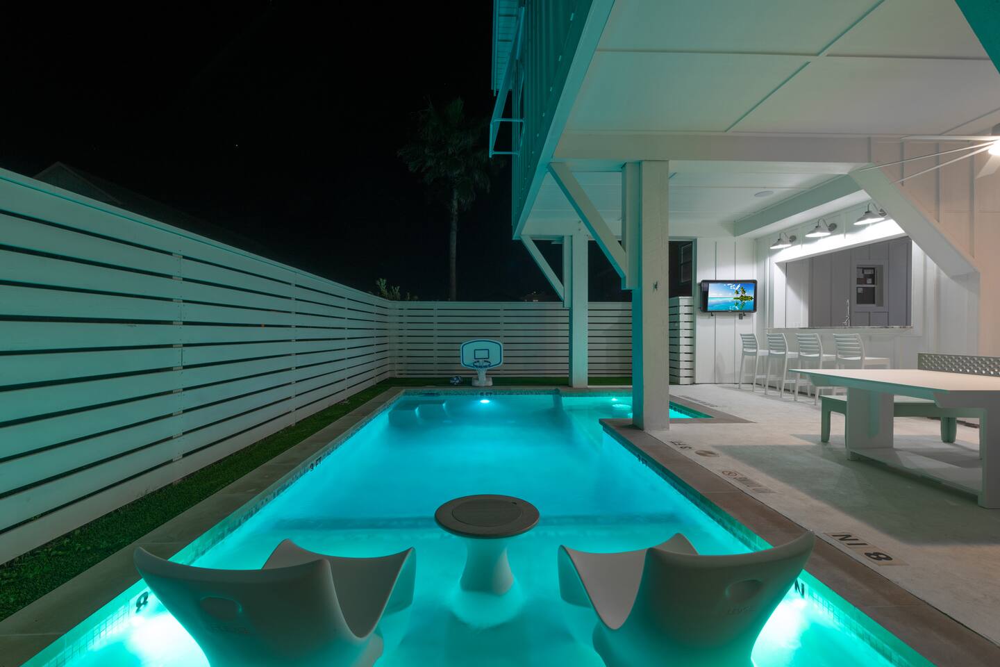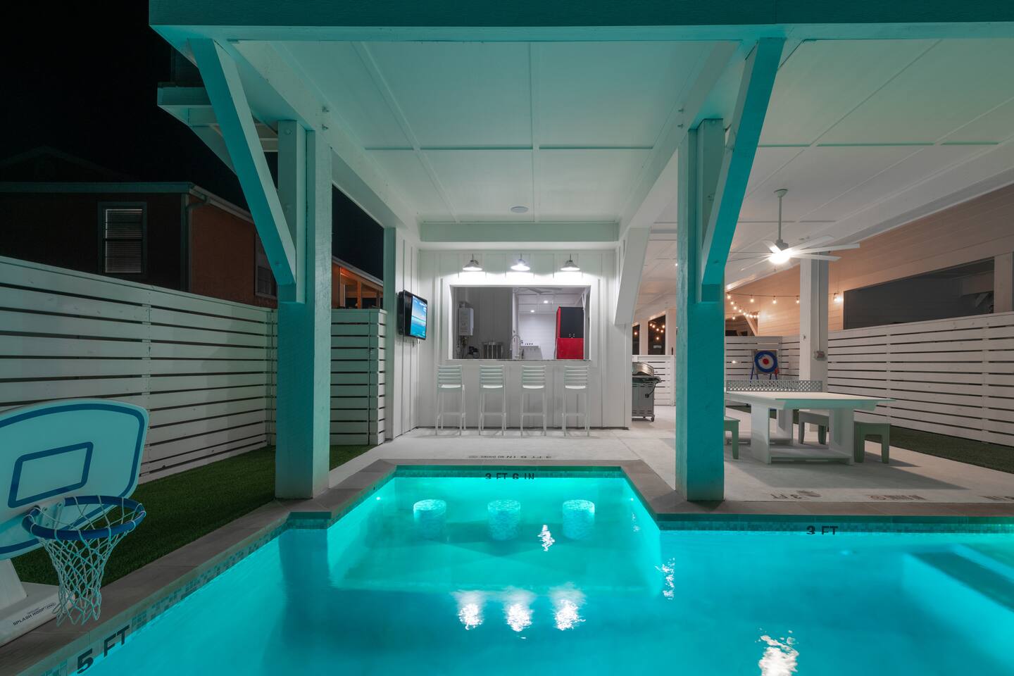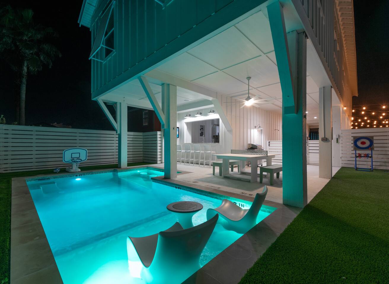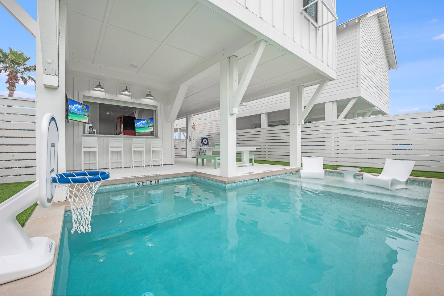 The ULTIMATE Beach House in Port A (Built in 2023) with a game room + pool bar! Top-Notch furnishings. Private Pool w/ barstools in pool (free heated pool), outdoor games, arcade machines (Golden Tee, Hoop Fever, Pacman), Commercial Sonic Ice Machine + 6 Seater Golf Cart included! Centrally located in town, minutes to beach, restaurants, and grocery store. EV charger, outdoor shower, built-in Sonos speakers throughout + TVs everywhere! Sleeps 12 (8 Adults Max) Custom bunk-room for the kids