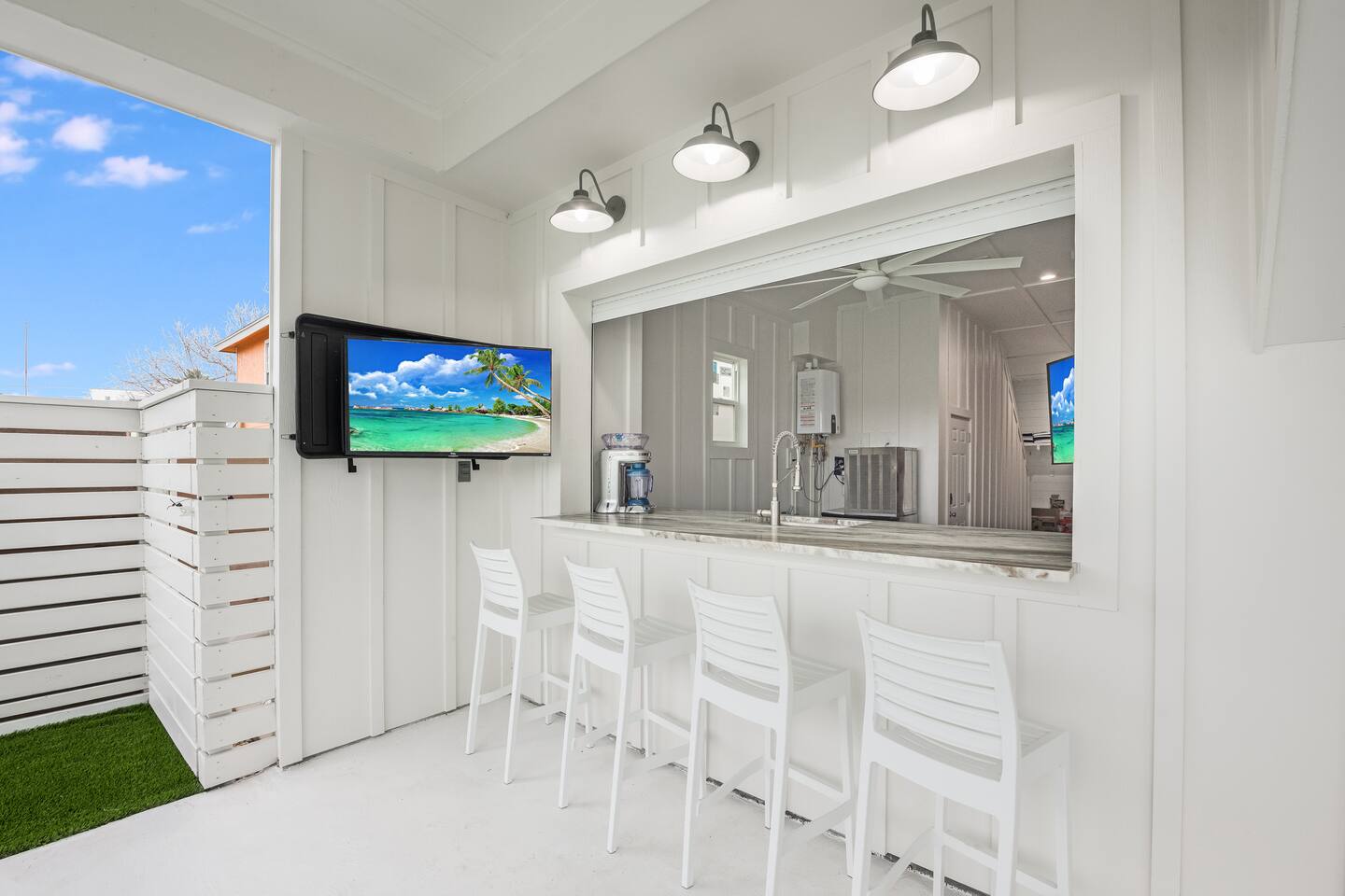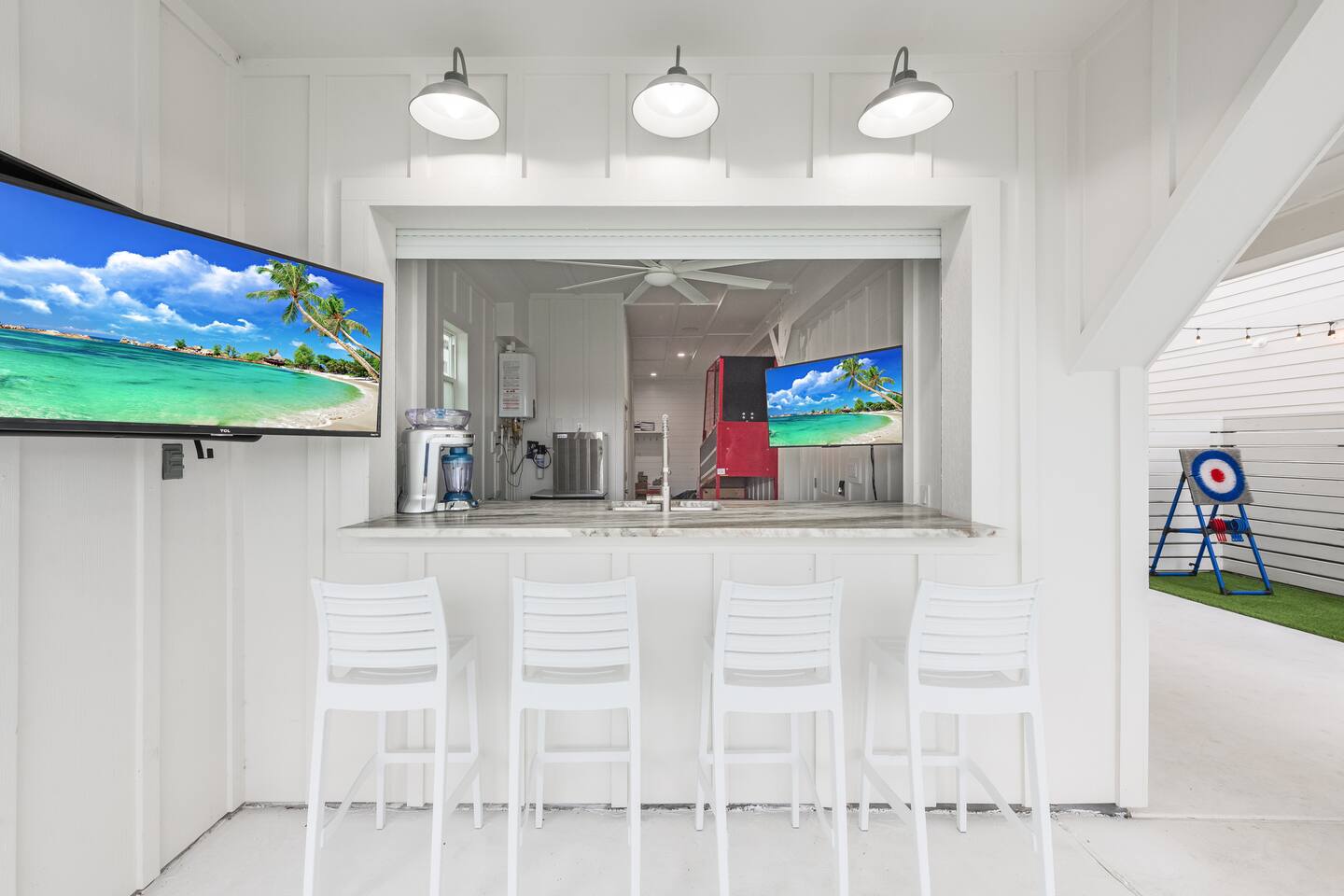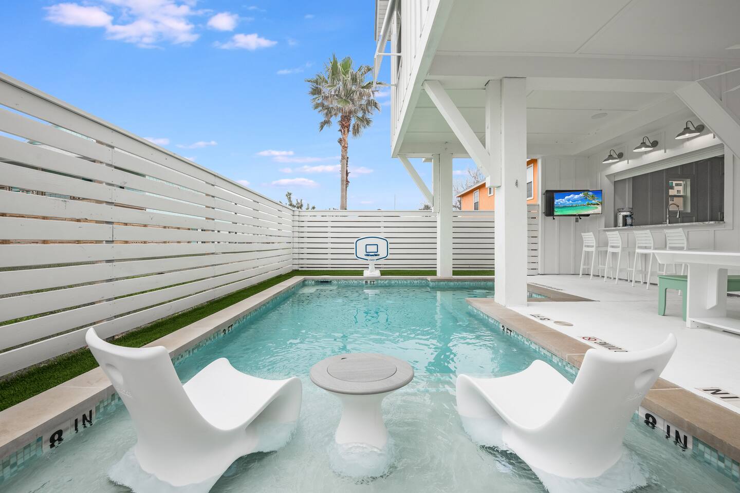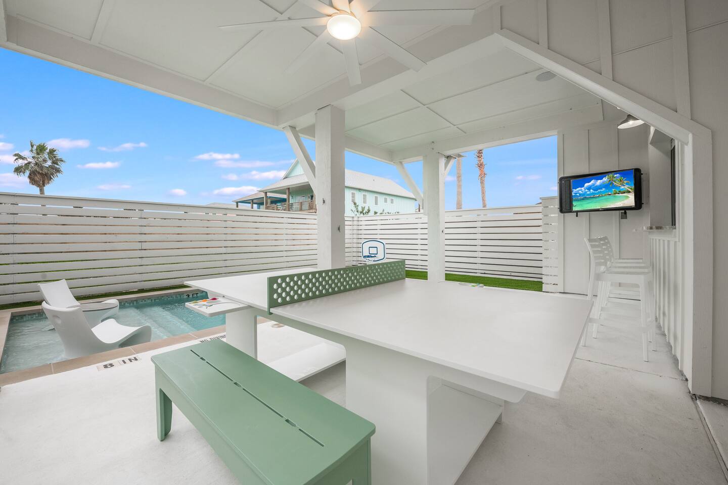 The ULTIMATE Beach House in Port A (Built in 2023) with a game room + pool bar! Top-Notch furnishings. Private Pool w/ barstools in pool (free heated pool), outdoor games, arcade machines (Golden Tee, Hoop Fever, Pacman), Commercial Sonic Ice Machine + 6 Seater Golf Cart included! Centrally located in town, minutes to beach, restaurants, and grocery store. EV charger, outdoor shower, built-in Sonos speakers throughout + TVs everywhere! Sleeps 12 (8 Adults Max) Custom bunk-room for the kids